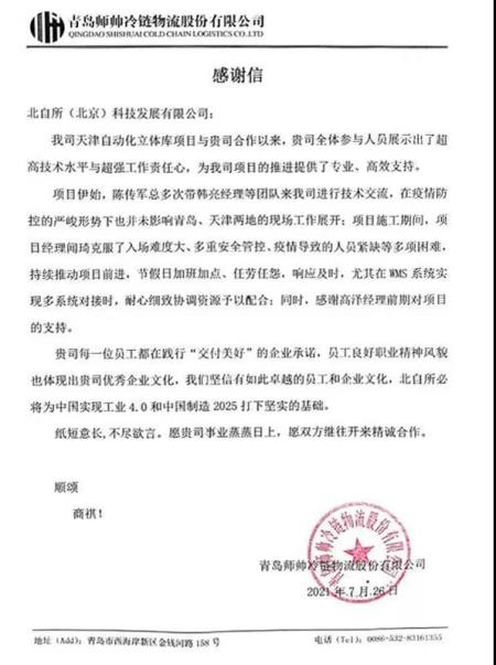 項目執(zhí)行過程中,正值新冠疫情在我國冷鏈行業(yè)肆虐之時,北自科技團隊展示了良好的精神風(fēng)貌和職業(yè)素養(yǎng),克服了重重困難,以認(rèn)真的態(tài)度、專業(yè)的管理和過硬的技術(shù)感動了客戶,客戶特地發(fā)來感謝信,以表彰北自科技團隊在項目中的突出表現(xiàn)。