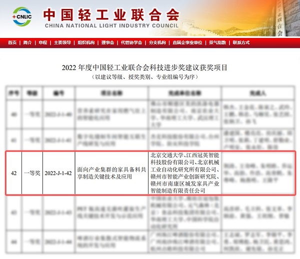 近日,中國(guó)輕工業(yè)聯(lián)合會(huì)在官網(wǎng)發(fā)布了經(jīng)評(píng)審?fù)ㄟ^的“2022年度中國(guó)輕工業(yè)聯(lián)合會(huì)科學(xué)技術(shù)獎(jiǎng)建議獲獎(jiǎng)項(xiàng)目”名單。北京機(jī)械工業(yè)自動(dòng)化研究所有限公司(簡(jiǎn)稱北自所)參與完成的《面向產(chǎn)業(yè)集群的家具備料共享制造關(guān)鍵技術(shù)與應(yīng)用》項(xiàng)目,榮獲2022年度中國(guó)輕工業(yè)聯(lián)合會(huì)科技進(jìn)步一等獎(jiǎng)。