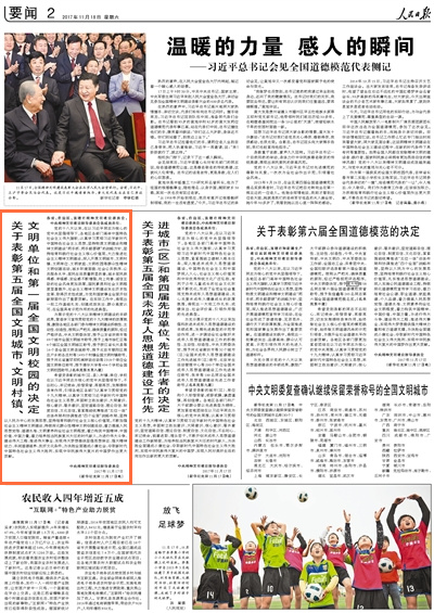 11月17日,全國(guó)精神文明建設(shè)表彰大會(huì)在京舉行。中共中央總書記、國(guó)家主席、中央軍委主席習(xí)近平在人民大會(huì)堂親切會(huì)見參加大會(huì)的新一屆全國(guó)文明城市、文明村鎮(zhèn)、文明單位、文明校園、未成年人思想道德建設(shè)工作先進(jìn)代表和全國(guó)道德模范代表,向全體代表表示熱烈的祝賀,勉勵(lì)他們?cè)俳釉賲枺谏鐣?huì)主義精神文明建設(shè)中再立新功、作出表率。