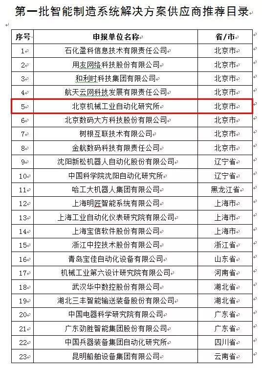 12月4日,為深入貫徹落實(shí)《中國(guó)制造2025》(國(guó)發(fā)〔2015〕28號(hào))和《智能制造發(fā)展規(guī)劃(2016-2020年)》(工信部聯(lián)規(guī)〔2016〕349號(hào)),加快培育智能制造系統(tǒng)解決方案供應(yīng)商,經(jīng)企業(yè)申報(bào)、專家評(píng)審、網(wǎng)上公示,工業(yè)和信息化部確定了第一批智能制造系統(tǒng)解決方案供應(yīng)商推薦目錄,北京機(jī)械工業(yè)自動(dòng)化研究所(以下簡(jiǎn)稱北自所)位列其中。