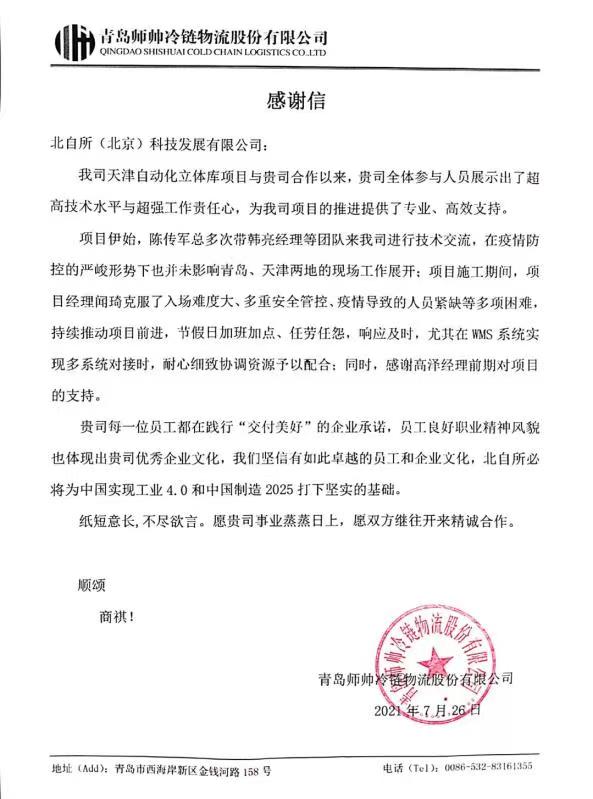 項(xiàng)目執(zhí)行過程中,正值新冠疫情在我國冷鏈行業(yè)肆虐之時(shí),北自科技團(tuán)隊(duì)展示了良好的精神風(fēng)貌和職業(yè)素養(yǎng),克服了重重困難,以認(rèn)真的態(tài)度、專業(yè)的管理和過硬的技術(shù)感動(dòng)了客戶,客戶特地發(fā)來感謝信,以表彰北自科技團(tuán)隊(duì)在項(xiàng)目中的突出表現(xiàn)。